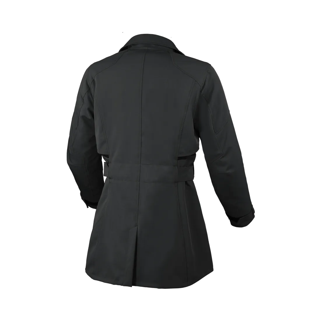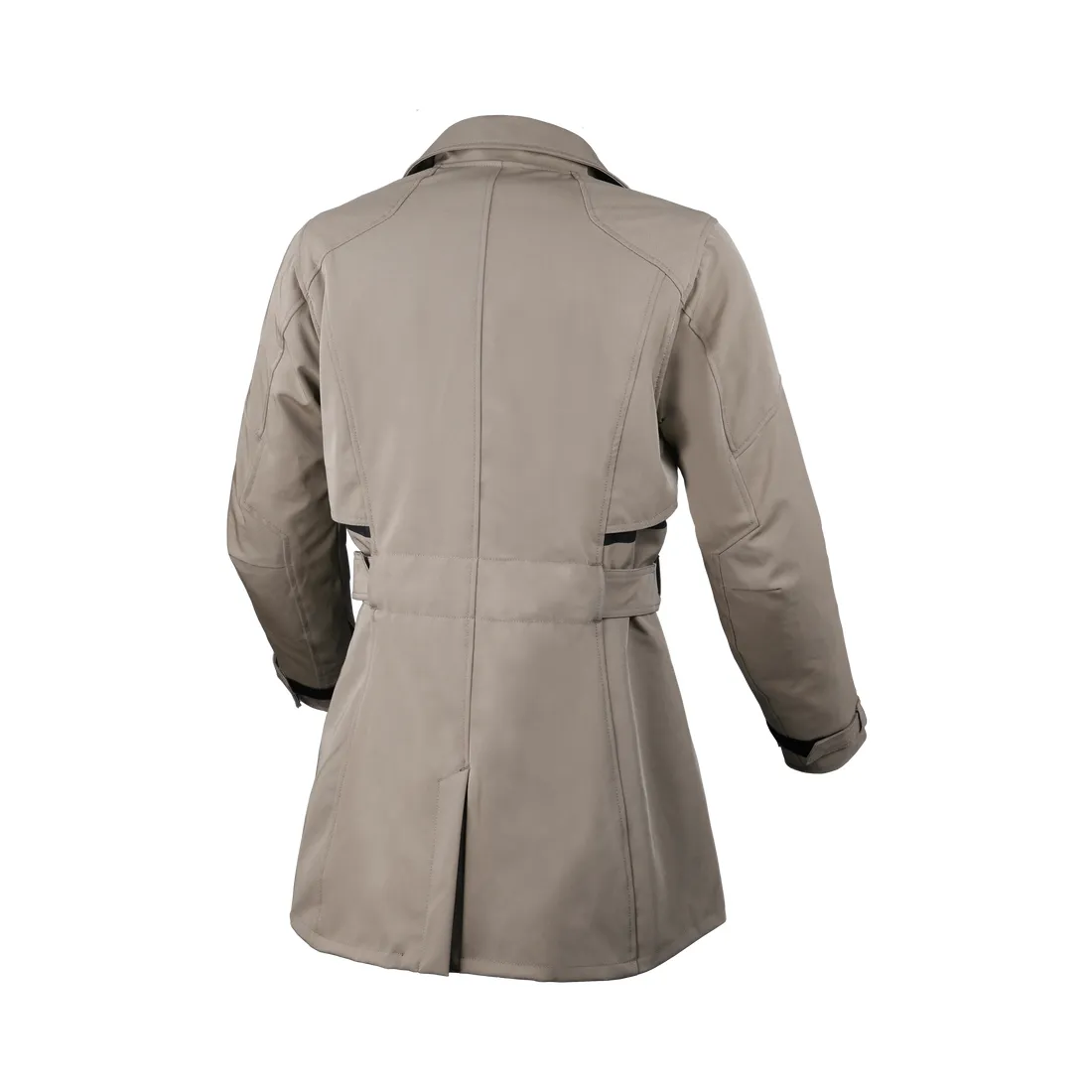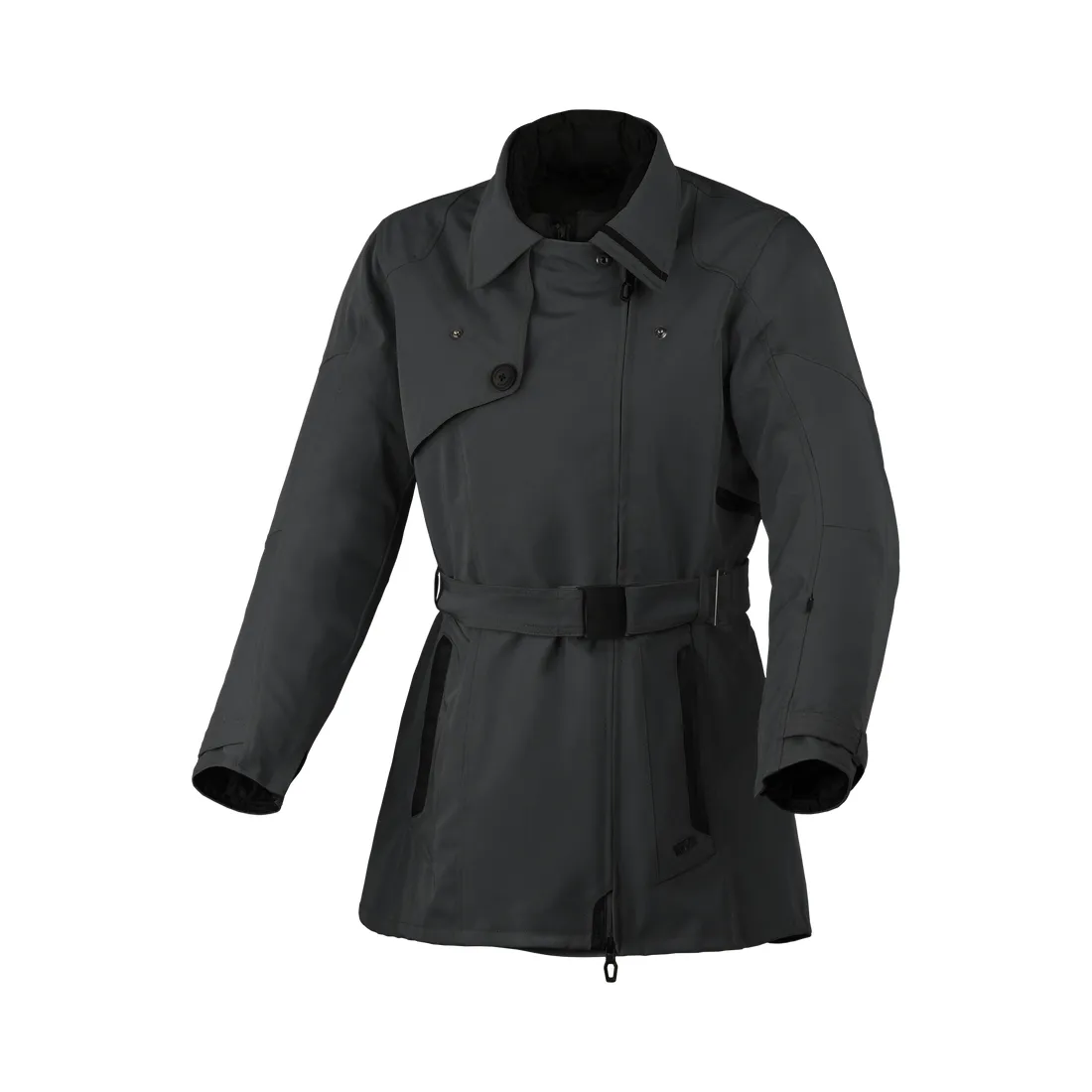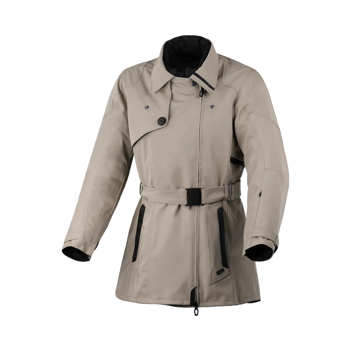 Uma gabardina feminina única, impermeável, especificamente concebida para as senhoras na city e adequada para condições de condução frias a amenas/chuvosas.